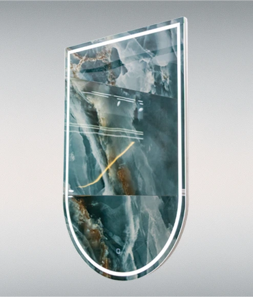 Sublimez votre salle de bain avec le miroir MIR. 105/75 LED Demi-Arcade, une pièce maîtresse qui fusionne l’art décoratif et la technologie moderne. Ce modèle exclusif se distingue par son fond inspiré des profondeurs maritimes islandaises (Iceland Navy), créant un contraste saisissant avec son cadre lumineux intégré.